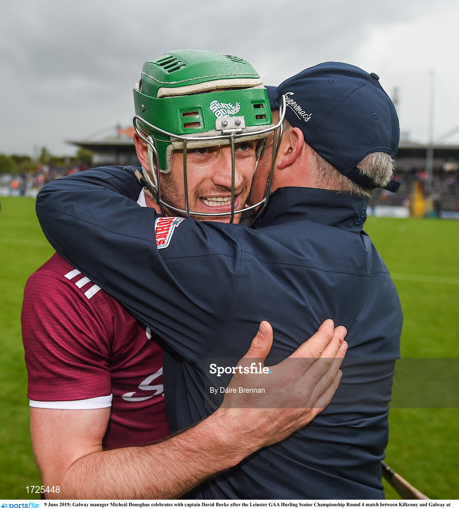 9 June 2019; Galway manager Mícheál Donoghue celebrates with captain David Burke after the Leinster GAA Hurling Senior Championship Round 4 match between Kilkenny and Galway at Nowlan Park in Kilkenny. Photo by Daire Brennan/Sportsfile
