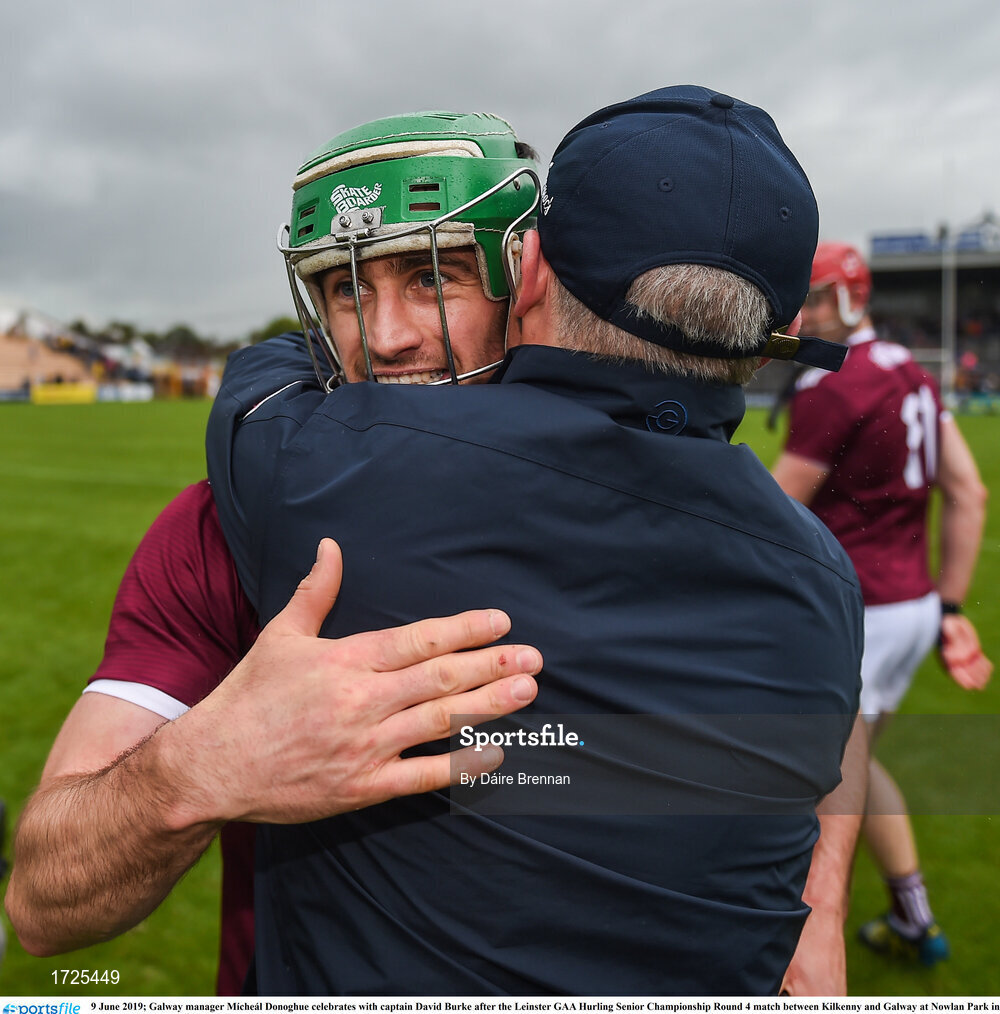 9 June 2019; Galway manager Mícheál Donoghue celebrates with captain David Burke after the Leinster GAA Hurling Senior Championship Round 4 match between Kilkenny and Galway at Nowlan Park in Kilkenny. Photo by Daire Brennan/Sportsfile