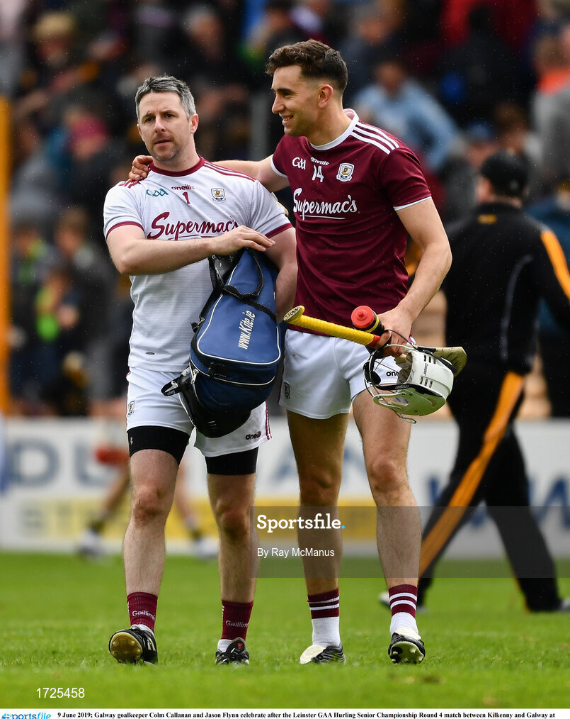 9 June 2019; Galway goalkeeper Colm Callanan and Jason Flynn celebrate after the Leinster GAA Hurling Senior Championship Round 4 match between Kilkenny and Galway at Nowlan Park in Kilkenny. Photo by Ray McManus/Sportsfile