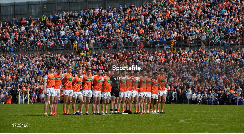 9 June 2019; The Armagh team stand for the national anthem before the Ulster GAA Football Senior Championship Semi-Final Replay match between Cavan and Armagh at St Tiarnach's Park in Clones, Monaghan. Photo by Oliver McVeigh/Sportsfile