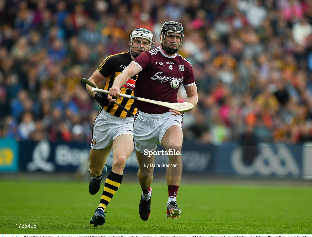 9 June 2019; Aidan Harte of Galway in action against TJ Reid of Kilkenny during the Leinster GAA Hurling Senior Championship Round 4 match between Kilkenny and Galway at Nowlan Park in Kilkenny. Photo by Daire Brennan/Sportsfile
