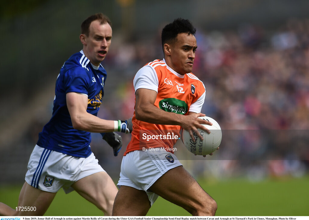 9 June 2019; Jemar Hall of Armagh in action against Martin Reilly of Cavan during the Ulster GAA Football Senior Championship Semi-Final Replay match between Cavan and Armagh at St Tiarnach's Park in Clones, Monaghan. Photo by Oliver McVeigh/Sportsfile