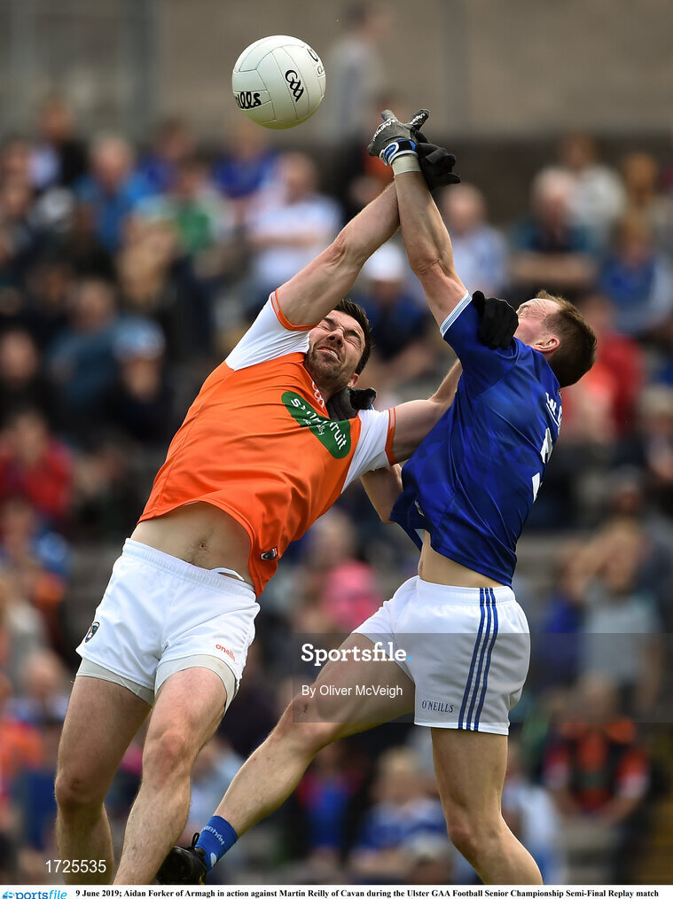 9 June 2019; Aidan Forker of Armagh in action against Martin Reilly of Cavan during the Ulster GAA Football Senior Championship Semi-Final Replay match between Cavan and Armagh at St Tiarnach's Park in Clones, Monaghan. Photo by Oliver McVeigh/Sportsfile