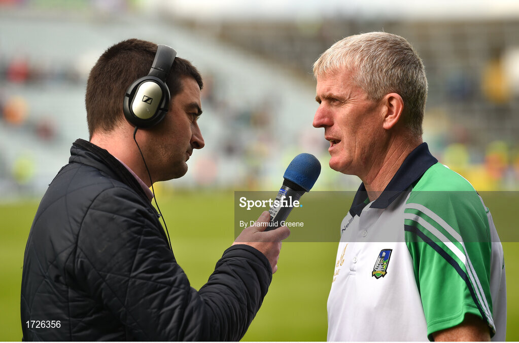 9 June 2019; Limerick manager John Kiely is interviewed by Liam Aherne of RTE after the Munster GAA Hurling Senior Championship Round 4 match between Limerick and Clare at the LIT Gaelic Grounds in Limerick. Photo by Diarmuid Greene/Sportsfile