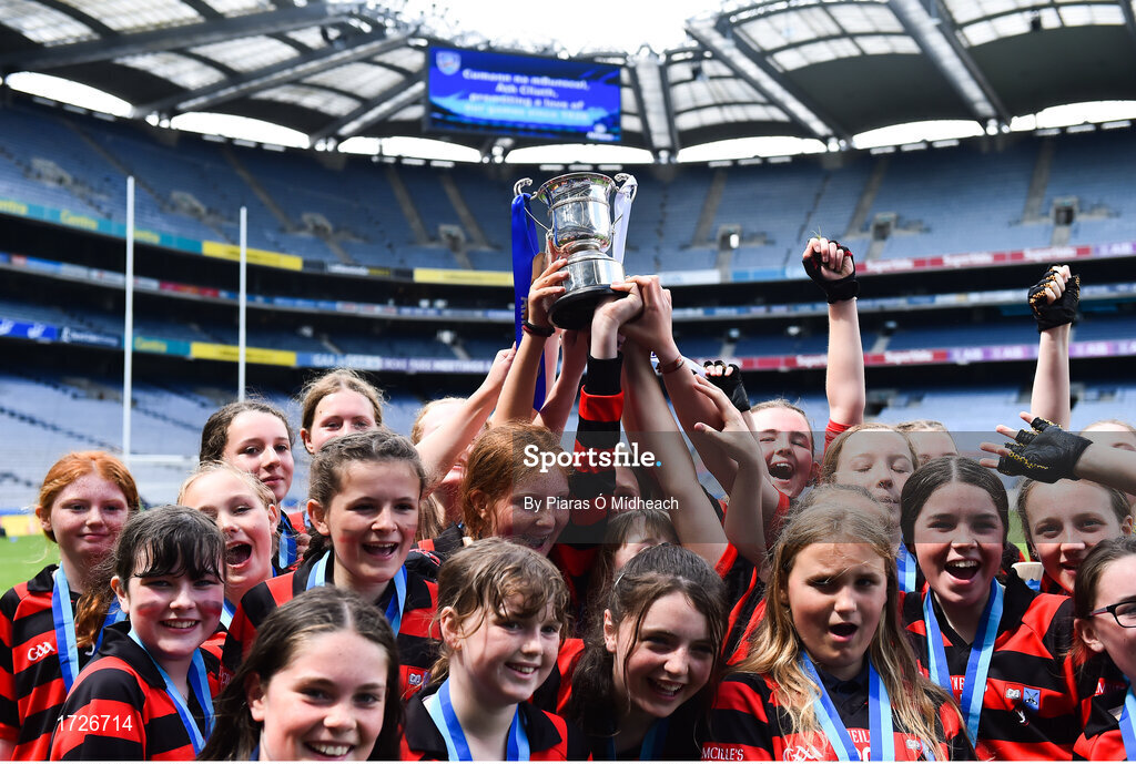 10 June 2019; St Colmcille's SNS Knocklyon players celebrate after winning the Corn Bean Uí Phuirseil Cup Final against St Pius X GNS, Terenure, during the Allianz Cumann na mBunscol Finals 2019 at Croke Park in Dublin. Photo by Piaras Ó Mídheach/Sportsfile