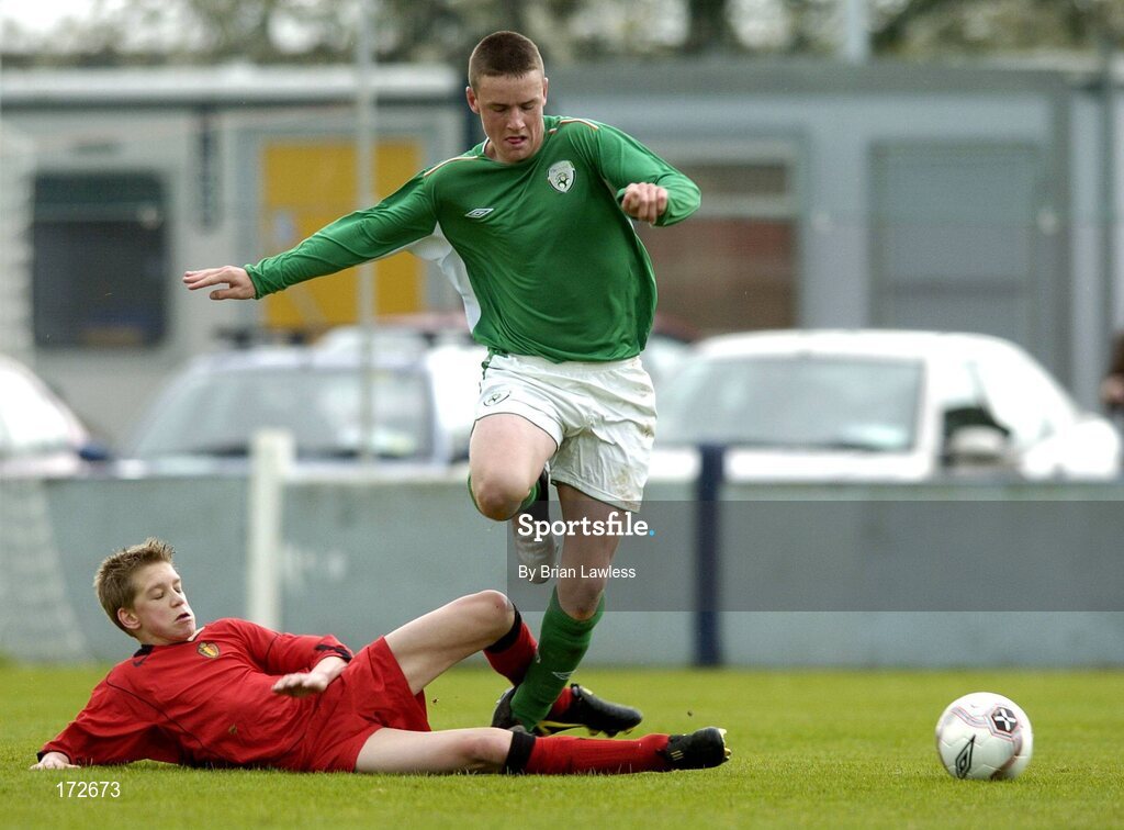 7 April 2005; Conor Kavanagh, Republic of Ireland U15, in action against Michiel Jonckheere, Belgium U15. U15 Friendly International, Republic of Ireland U15 v Belgium U15, Home Farm FC, Whitehall, Dublin. Picture credit; Brian Lawless / SPORTSFILE