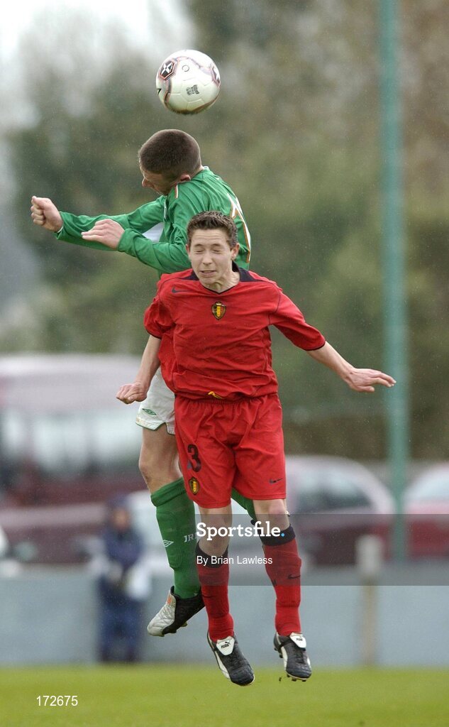 7 April 2005; Conor Kavanagh, Republic of Ireland U15, in action against Michele Zotti, Belgium U15. U15 Friendly International, Republic of Ireland U15 v Belgium U15, Home Farm FC, Whitehall, Dublin. Picture credit; Brian Lawless / SPORTSFILE