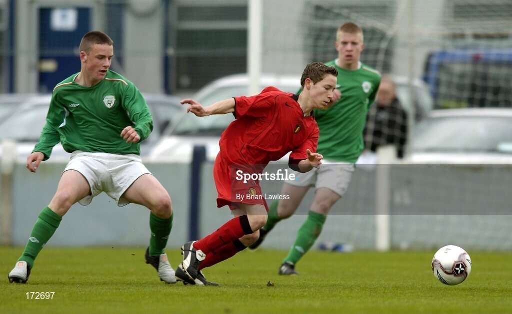7 April 2005; Michele Zotti, Belgium U15, in action against Conor Kavanagh, Republic of Ireland U15. U15 Friendly International, Republic of Ireland U15 v Belgium U15, Home Farm FC, Whitehall, Dublin. Picture credit; Brian Lawless / SPORTSFILE
