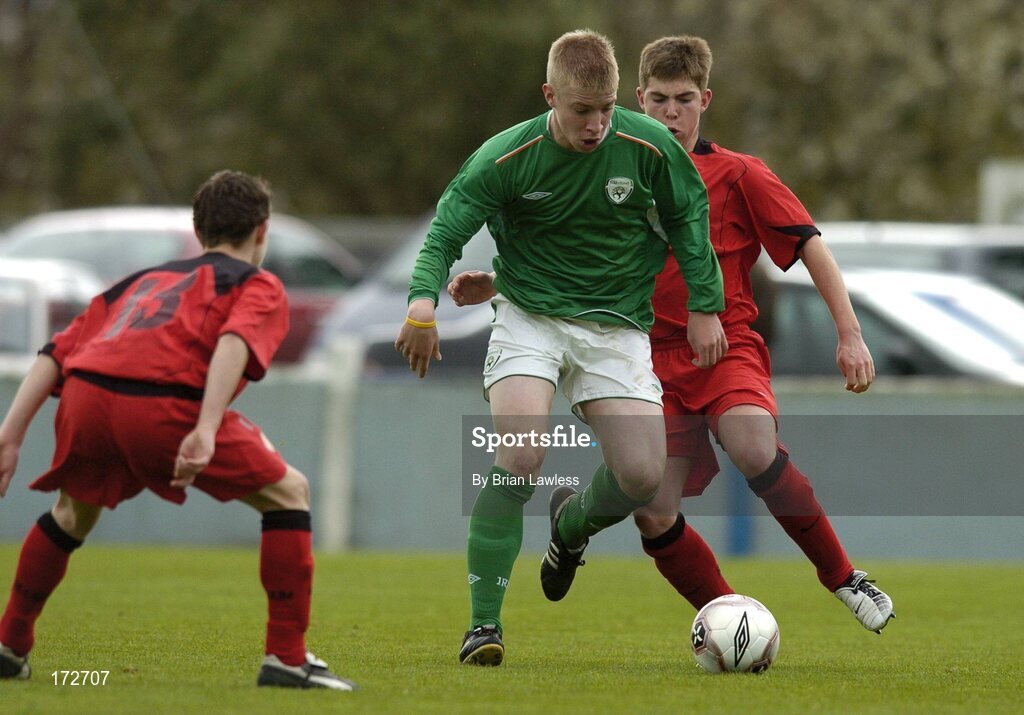 7 April 2005; Barry John Walsh, Republic of Ireland U15, in action against Michele Zotti, left, and Thorkild Van Wymeersch, Belgium U15. U15 Friendly International, Republic of Ireland U15 v Belgium U15, Home Farm FC, Whitehall, Dublin. Picture credit; Brian Lawless / SPORTSFILE