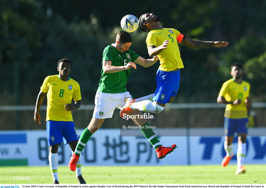 12 June 2019; Conor Coventry of Republic of Ireland in action against Douglas Luiz of Brazil during the 2019 Maurice Revello Toulon Tournament Semi-Final match between Brazil and Republic of Ireland at Stade De Lattre in Aubagne, France. Photo by Alexandre Dimou/Sportsfile