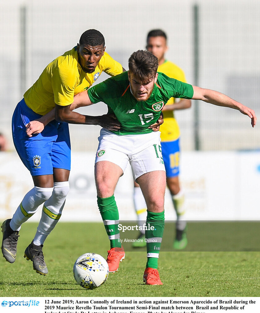 12 June 2019; Aaron Connolly of Ireland in action against Emerson Aparecido of Brazil during the 2019 Maurice Revello Toulon Tournament Semi-Final match between Brazil and Republic of Ireland at Stade De Lattre in Aubagne, France. Photo by Alexandre Dimou