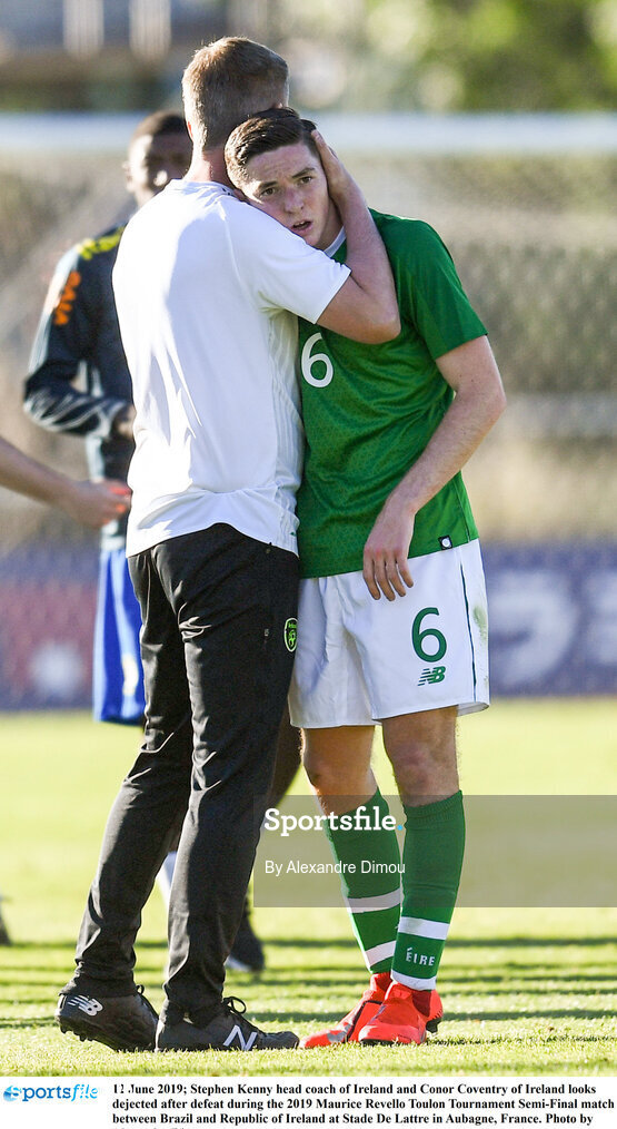 12 June 2019; Stephen Kenny head coach of Ireland and Conor Coventry of Ireland looks dejected after defeat during the 2019 Maurice Revello Toulon Tournament Semi-Final match between Brazil and Republic of Ireland at Stade De Lattre in Aubagne, France. Photo by Alexandre Dimou
