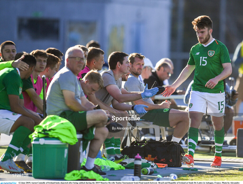 12 June 2019; Aaron Connolly of Ireland looks dejected after being subbed during the 2019 Maurice Revello Toulon Tournament Semi-Final match between Brazil and Republic of Ireland at Stade De Lattre in Aubagne, France. Photo by Alexandre Dimou