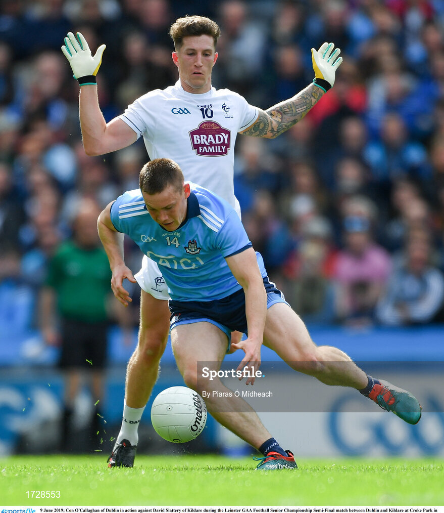 9 June 2019; Con O'Callaghan of Dublin in action against David Slattery of Kildare during the Leinster GAA Football Senior Championship Semi-Final match between Dublin and Kildare at Croke Park in Dublin. Photo by Piaras Ó Mídheach/Sportsfile