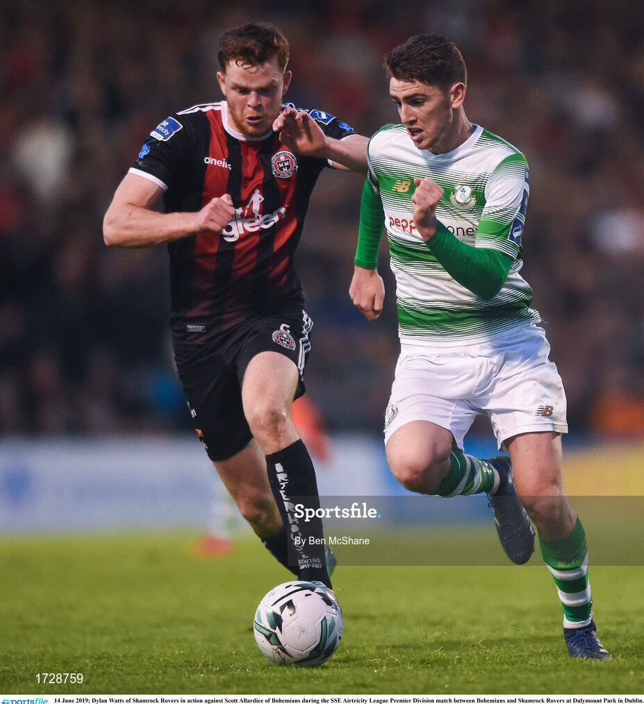 14 June 2019; Dylan Watts of Shamrock Rovers in action against Scott Allardice of Bohemians during the SSE Airtricity League Premier Division match between Bohemians and Shamrock Rovers at Dalymount Park in Dublin. Photo by Ben McShane/Sportsfile