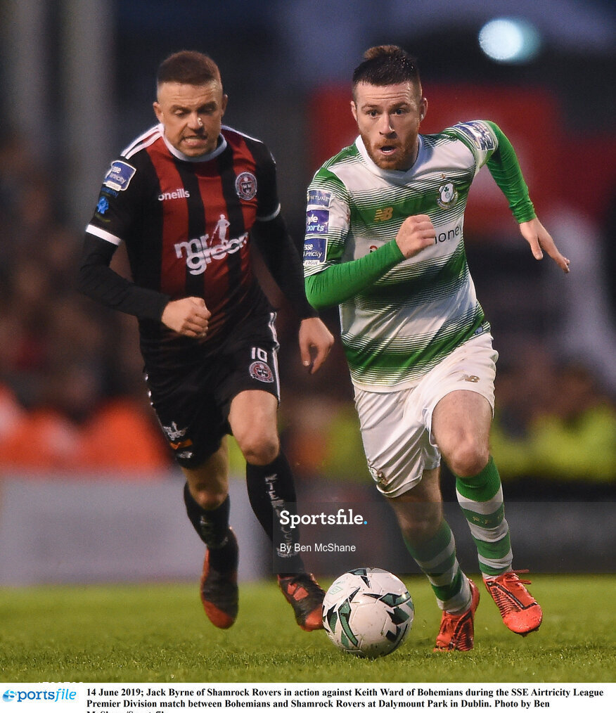 14 June 2019; Jack Byrne of Shamrock Rovers in action against Keith Ward of Bohemians during the SSE Airtricity League Premier Division match between Bohemians and Shamrock Rovers at Dalymount Park in Dublin. Photo by Ben McShane/Sportsfile