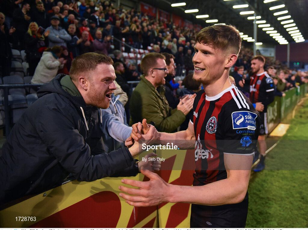 14 June 2019; Ryan Swan of Bohemians celebrates with supporters following his side's victory after the SSE Airtricity League Premier Division match between Bohemians and Shamrock Rovers at Dalymount Park in Dublin. Photo by Seb Daly/Sportsfile