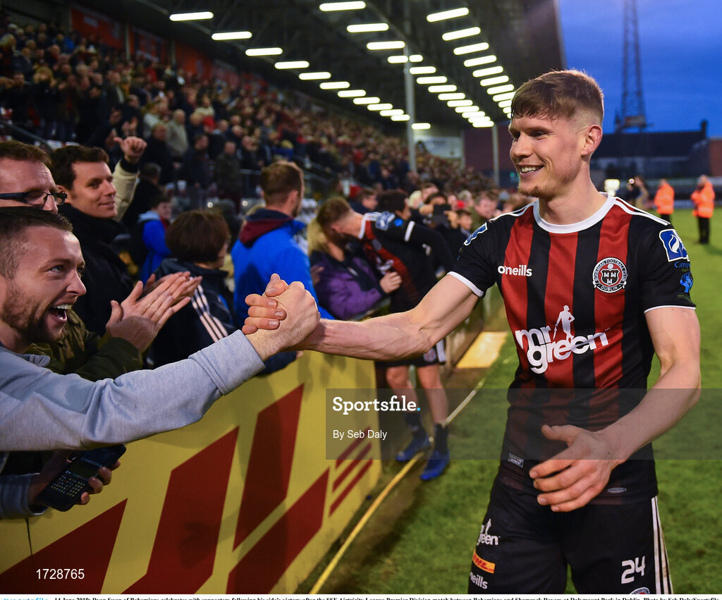 14 June 2019; Ryan Swan of Bohemians celebrates with supporters following his side's victory after the SSE Airtricity League Premier Division match between Bohemians and Shamrock Rovers at Dalymount Park in Dublin. Photo by Seb Daly/Sportsfile