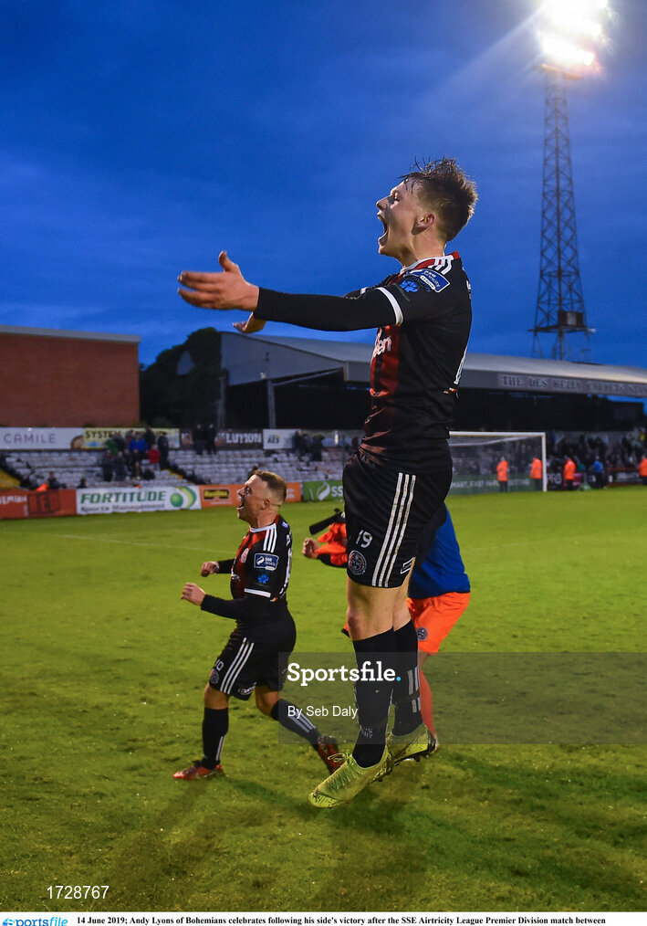 14 June 2019; Andy Lyons of Bohemians celebrates following his side's victory after the SSE Airtricity League Premier Division match between Bohemians and Shamrock Rovers at Dalymount Park in Dublin. Photo by Seb Daly/Sportsfile