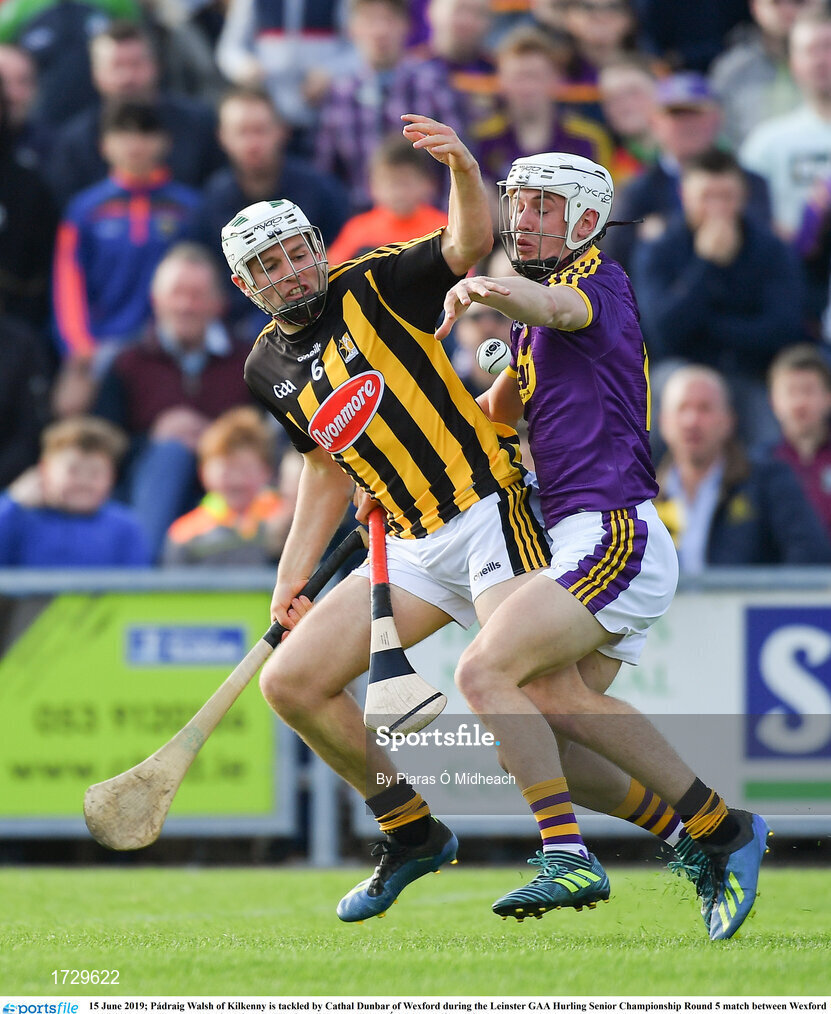 15 June 2019; Pádraig Walsh of Kilkenny is tackled by Cathal Dunbar of Wexford during the Leinster GAA Hurling Senior Championship Round 5 match between Wexford and Kilkenny at Innovate Wexford Park in Wexford. Photo by Piaras Ó Mídheach/Sportsfile