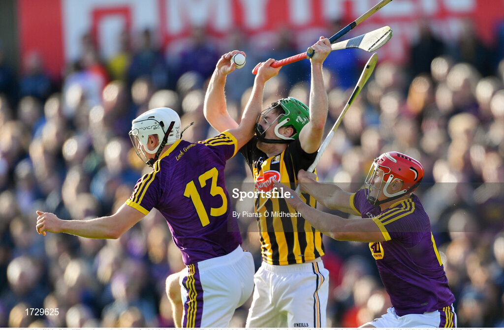 15 June 2019; Joey Holden of Kilkenny gathers possession under pressure from Cathal Dunbar, left, and Lee Chin of Wexford during the Leinster GAA Hurling Senior Championship Round 5 match between Wexford and Kilkenny at Innovate Wexford Park in Wexford. Photo by Piaras Ó Mídheach/Sportsfile
