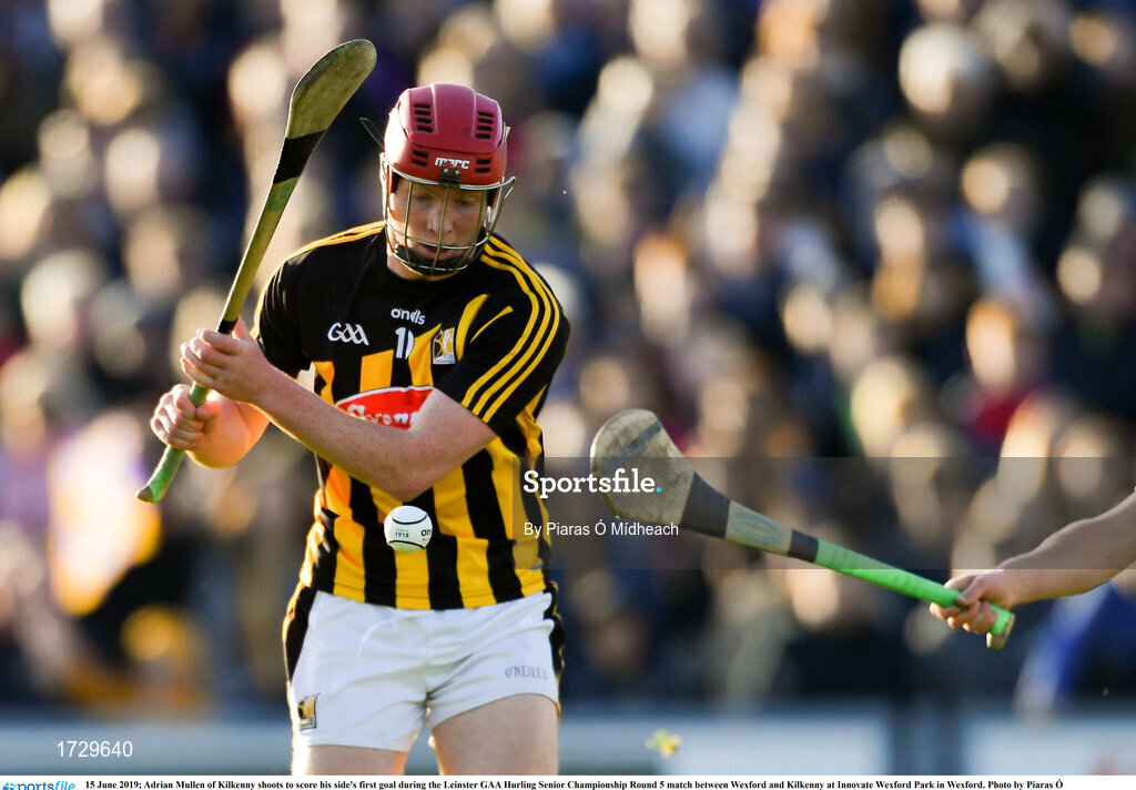 15 June 2019; Adrian Mullen of Kilkenny shoots to score his side's first goal during the Leinster GAA Hurling Senior Championship Round 5 match between Wexford and Kilkenny at Innovate Wexford Park in Wexford. Photo by Piaras Ó Mídheach/Sportsfile