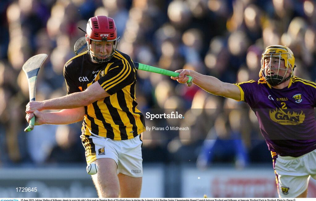 15 June 2019; Adrian Mullen of Kilkenny shoots to score his side's first goal as Damien Reck of Wexford closes in during the Leinster GAA Hurling Senior Championship Round 5 match between Wexford and Kilkenny at Innovate Wexford Park in Wexford. Photo by Piaras Ó Mídheach/Sportsfile