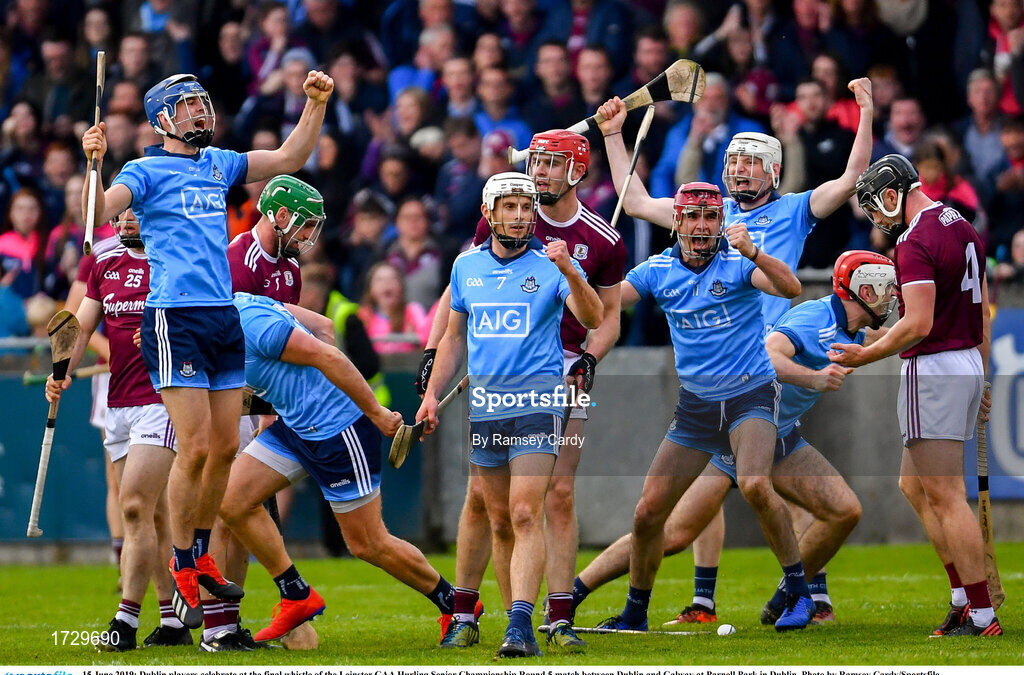 15 June 2019; Dublin players celebrate at the final whistle of the Leinster GAA Hurling Senior Championship Round 5 match between Dublin and Galway at Parnell Park in Dublin. Photo by Ramsey Cardy/Sportsfile