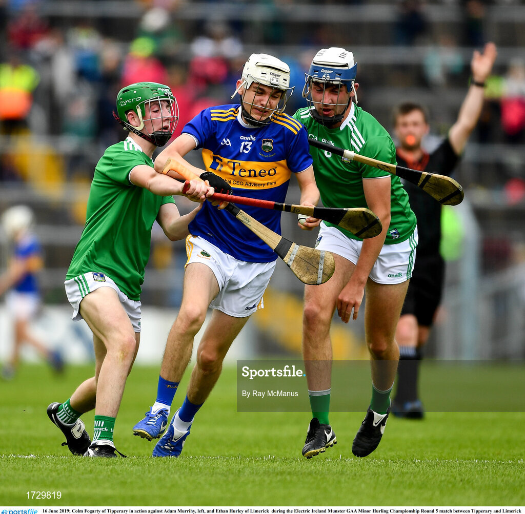 16 June 2019; Colm Fogarty of Tipperary in action against Adam Murrihy, left, and Ethan Hurley of Limerick during the Electric Ireland Munster GAA Minor Hurling Championship Round 5 match between Tipperary and Limerick in Semple Stadium, Thurles, in Tipperary. Photo by Ray McManus/Sportsfile