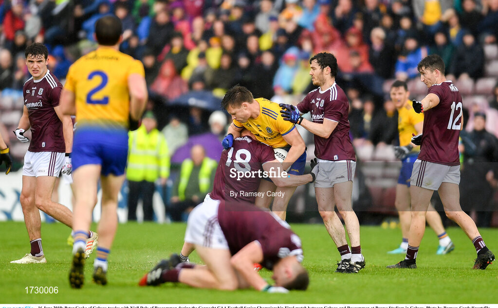 16 June 2019; Peter Cooke of Galway tussles with Niall Daly of Roscommon during the Connacht GAA Football Senior Championship Final match between Galway and Roscommon at Pearse Stadium in Galway. Photo by Ramsey Cardy/Sportsfile