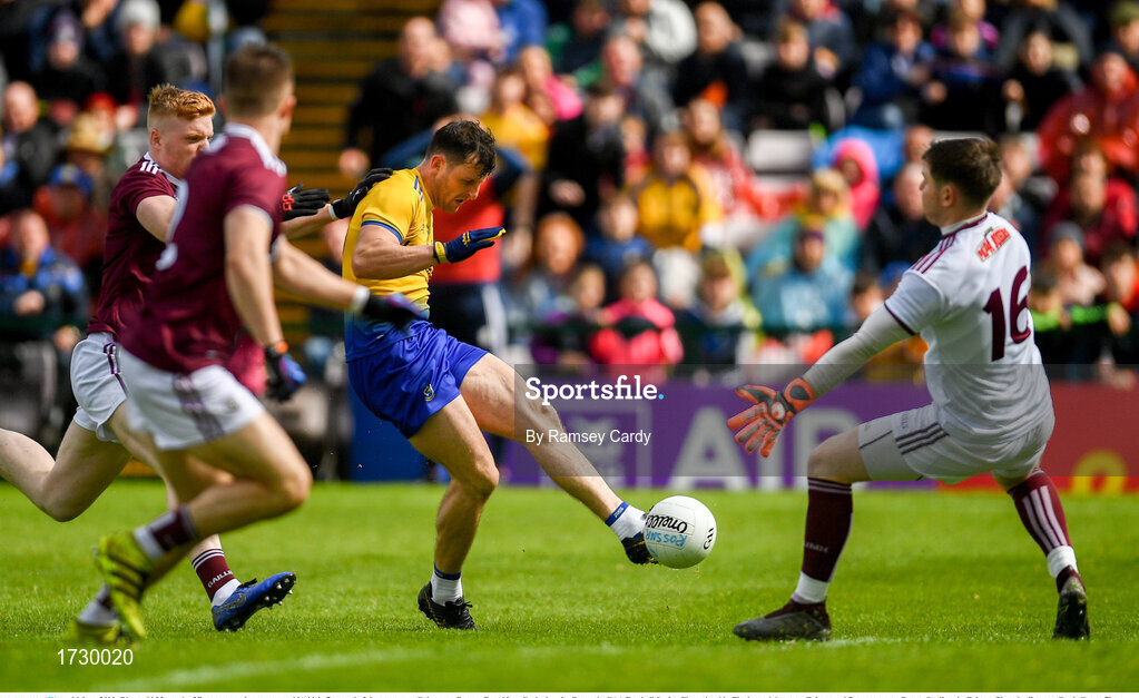 16 June 2019; Diarmuid Murtagh of Roscommon shoots to score his side's first goal of the game past Galway goalkeeper Ruarí Lavelle during the Connacht GAA Football Senior Championship Final match between Galway and Roscommon at Pearse Stadium in Galway. Photo by Ramsey Cardy/Sportsfile