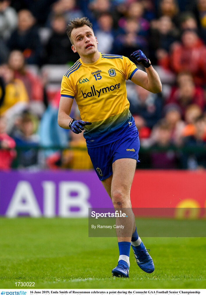 16 June 2019; Enda Smith of Roscommon celebrates a point during the Connacht GAA Football Senior Championship Final match between Galway and Roscommon at Pearse Stadium in Galway. Photo by Ramsey Cardy/Sportsfile