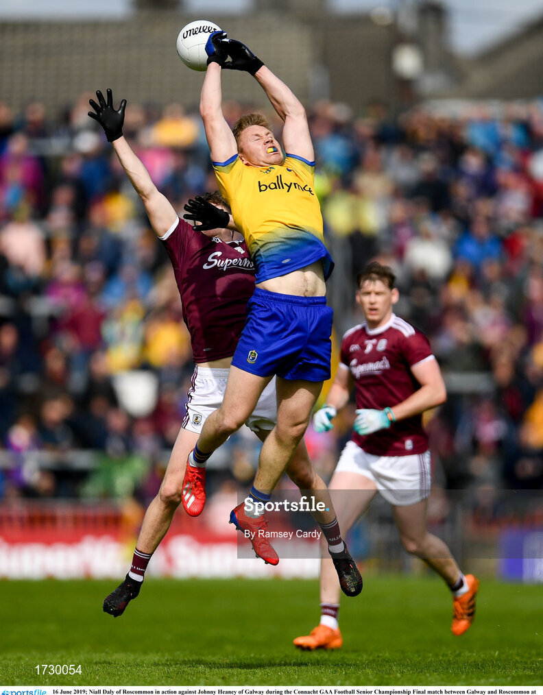 16 June 2019; Niall Daly of Roscommon in action against Johnny Heaney of Galway during the Connacht GAA Football Senior Championship Final match between Galway and Roscommon at Pearse Stadium in Galway. Photo by Ramsey Cardy/Sportsfile