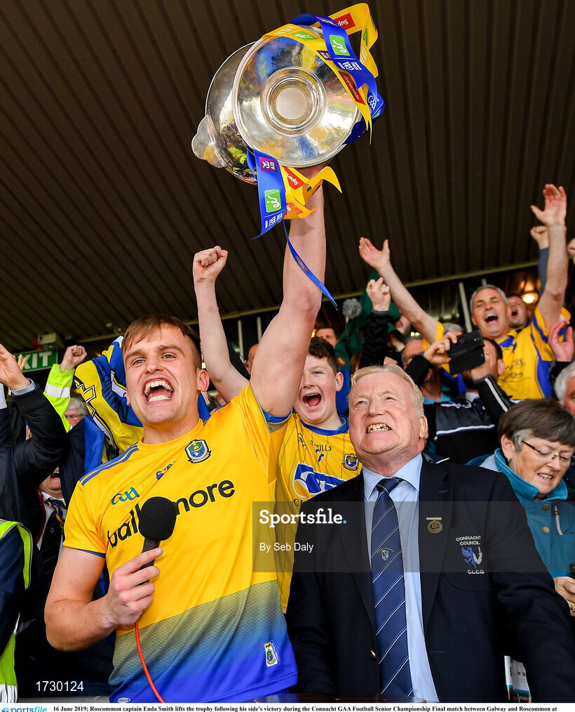 16 June 2019; Roscommon captain Enda Smith lifts the trophy following his side's victory during the Connacht GAA Football Senior Championship Final match between Galway and Roscommon at Pearse Stadium in Galway. Photo by Seb Daly/Sportsfile