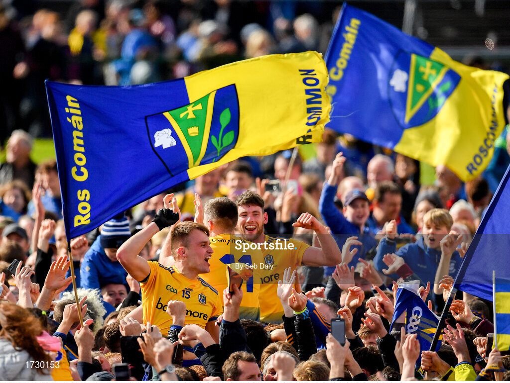 16 June 2019; Enda Smith of Roscommon celebrates with supporters following his side's victory during the Connacht GAA Football Senior Championship Final match between Galway and Roscommon at Pearse Stadium in Galway. Photo by Seb Daly/Sportsfile
