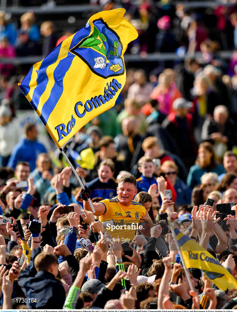 16 June 2019; Conor Cox of Roscommon celebrates with supporters following his side's victory during the Connacht GAA Football Senior Championship Final match between Galway and Roscommon at Pearse Stadium in Galway. Photo by Seb Daly/Sportsfile