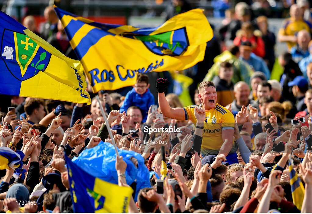 16 June 2019; Conor Cox of Roscommon celebrates with supporters following his side's victory during the Connacht GAA Football Senior Championship Final match between Galway and Roscommon at Pearse Stadium in Galway. Photo by Seb Daly/Sportsfile