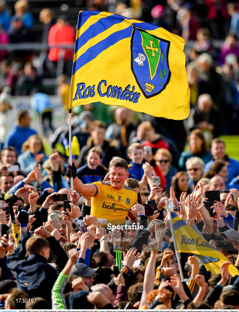 16 June 2019; Conor Cox of Roscommon celebrates with supporters following his side's victory during the Connacht GAA Football Senior Championship Final match between Galway and Roscommon at Pearse Stadium in Galway. Photo by Seb Daly/Sportsfile