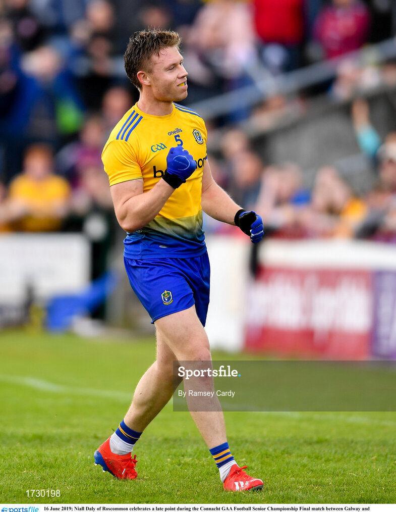 16 June 2019; Niall Daly of Roscommon celebrates a late point during the Connacht GAA Football Senior Championship Final match between Galway and Roscommon at Pearse Stadium in Galway. Photo by Ramsey Cardy/Sportsfile