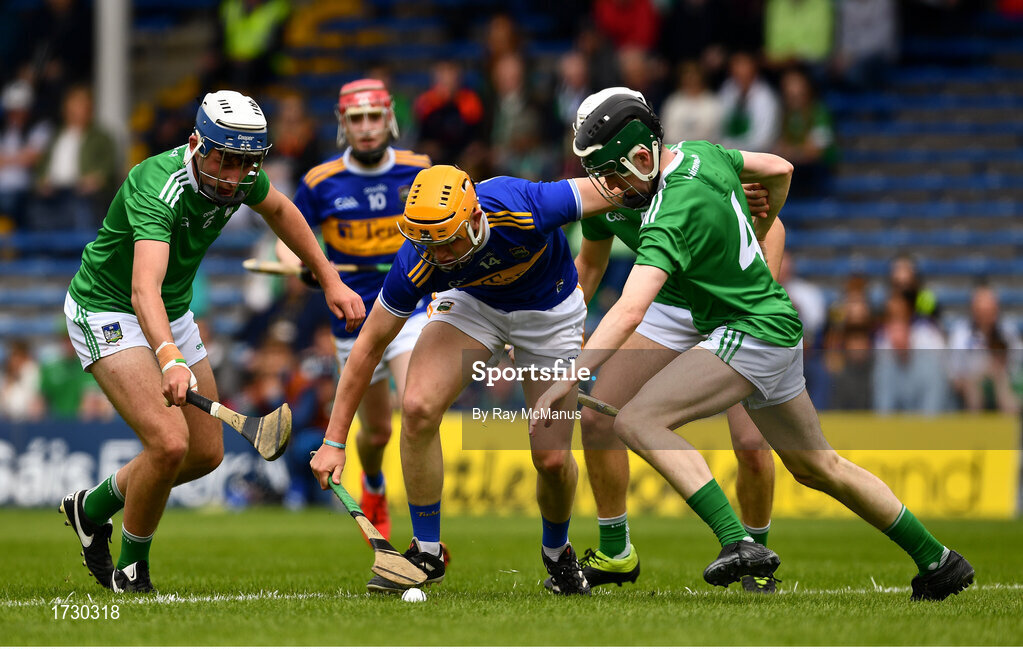 16 June 2019; Tony Cahill of Tipperary in action against Ethan Hurley, left, and Fergal O'Connor of Limerick during the Electric Ireland Munster GAA Minor Hurling Championship Round 5 match between Tipperary and Limerick in Semple Stadium in Thurles, Tipperary. Photo by Ray McManus/Sportsfile