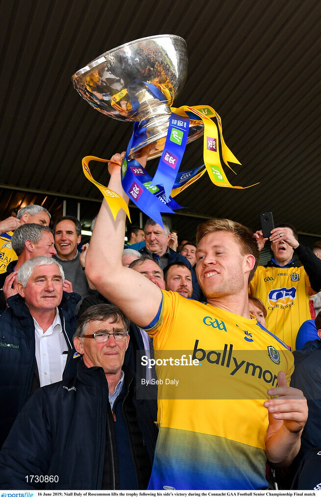 16 June 2019; Niall Daly of Roscommon lifts the trophy following his side's victory during the Connacht GAA Football Senior Championship Final match between Galway and Roscommon at Pearse Stadium in Galway. Photo by Seb Daly/Sportsfile