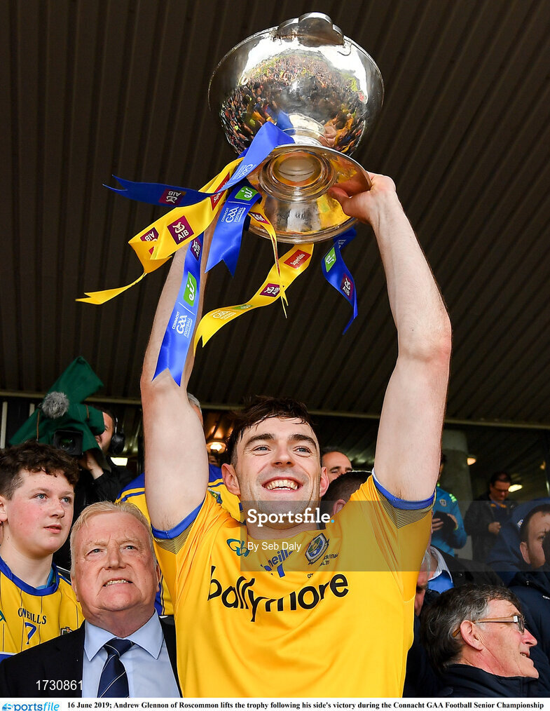 16 June 2019; Andrew Glennon of Roscommon lifts the trophy following his side's victory during the Connacht GAA Football Senior Championship Final match between Galway and Roscommon at Pearse Stadium in Galway. Photo by Seb Daly/Sportsfile