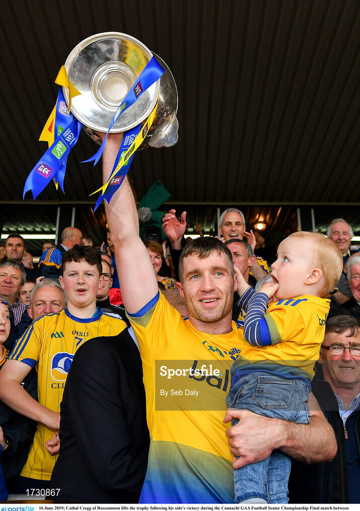 16 June 2019; Cathal Cregg of Roscommon lifts the trophy following his side's victory during the Connacht GAA Football Senior Championship Final match between Galway and Roscommon at Pearse Stadium in Galway. Photo by Seb Daly/Sportsfile