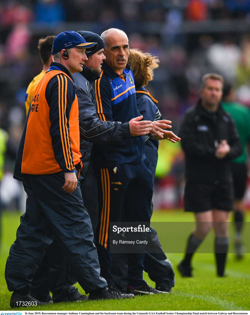 16 June 2019; Roscommon manager Anthony Cunningham and his backroom team during the Connacht GAA Football Senior Championship Final match between Galway and Roscommon at Pearse Stadium in Galway. Photo by Ramsey Cardy/Sportsfile
