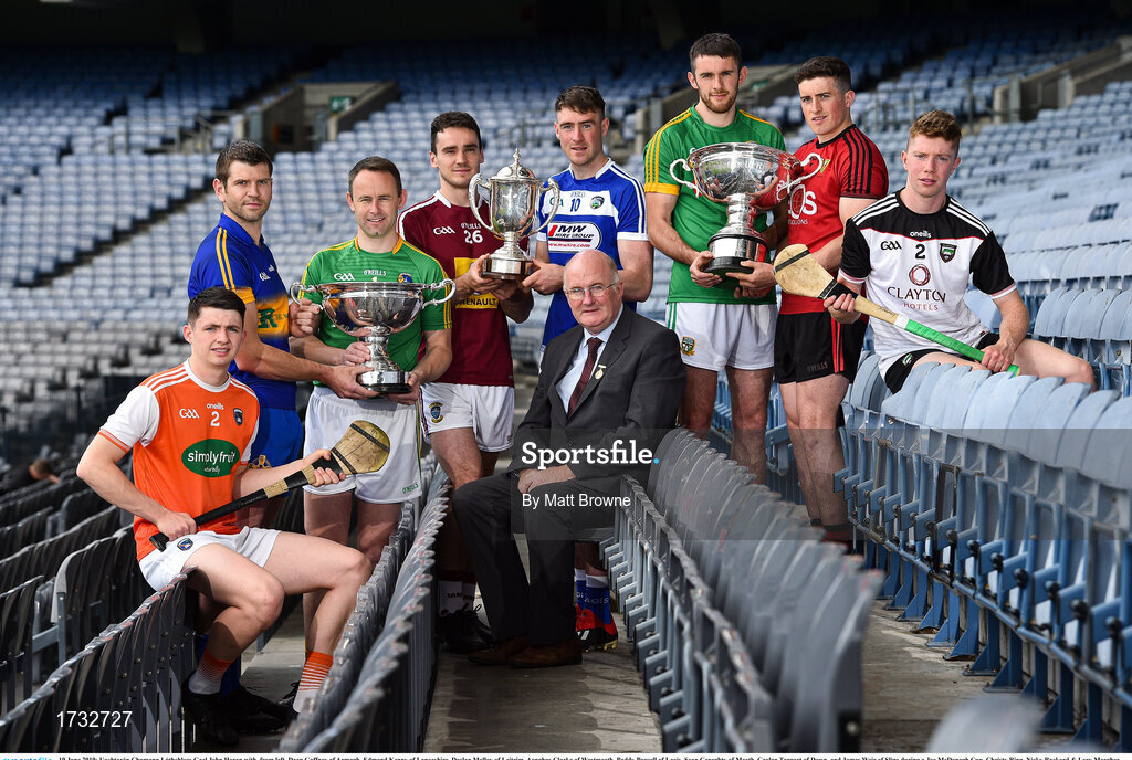 19 June 2019; Uachtarán Chumann Lúthchleas Gael John Horan with, from left, Dean Gaffney of Armagh, Edmond Kenny of Lancashire, Declan Molloy of Leitrim, Aonghus Clarke of Westmeath, Paddy Purcell of Laois, Sean Geraghty of Meath, Caolan Taggart of Down, and James Weir of Sligo during a Joe McDonagh Cup, Christy Ring, Nicky Rackard & Lory Meagher Cup Final media event at Croke Park in Dublin. Photo by Matt Browne/Sportsfile