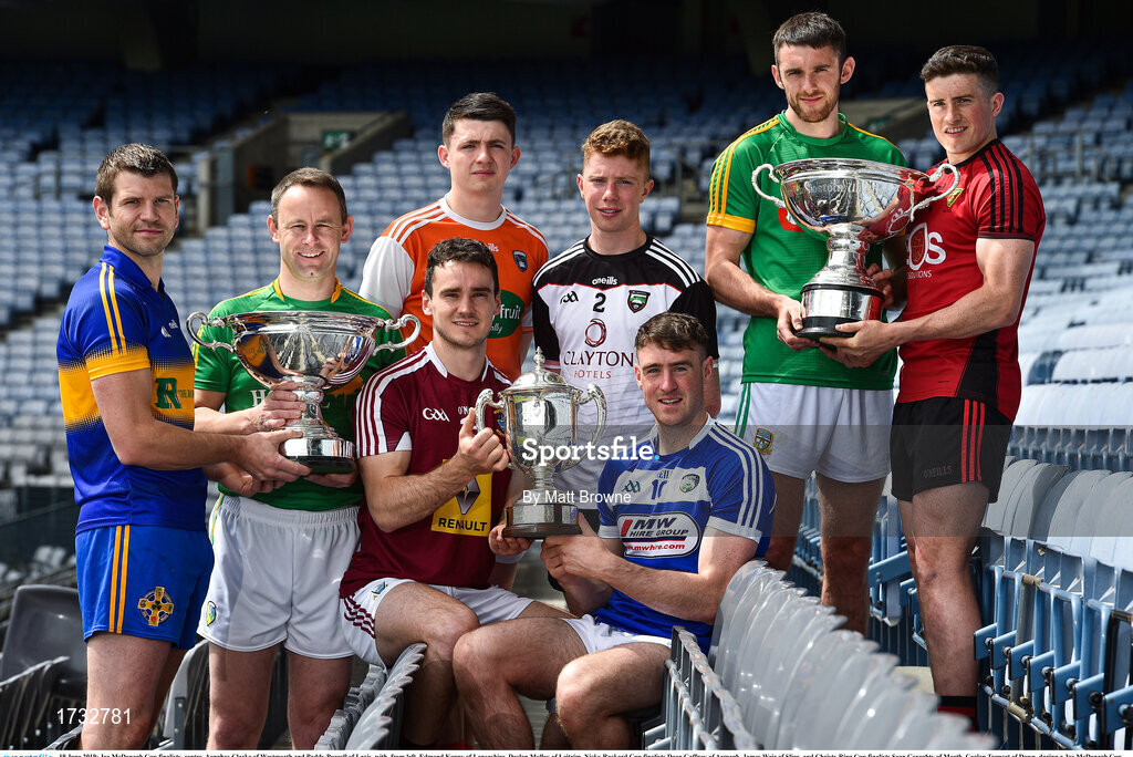 19 June 2019; Joe McDonagh Cup finalists, centre, Aonghus Clarke of Westmeath and Paddy Purcell of Laois, with, from left, Lory Meagher Cup finalist Edmond Kenny of Lancashire, Declan Molloy of Leitrim, Nicky Rackard Cup finalists Dean Gaffney of Armagh, James Weir of Sligo, and Christy Ring Cup finalists Sean Geraghty of Meath, Caolan Taggart of Down, during a Joe McDonagh Cup, Christy Ring, Nicky Rackard & Lory Meagher Cup Final media event at Croke Park in Dublin. Photo by Matt Browne/Sportsfile