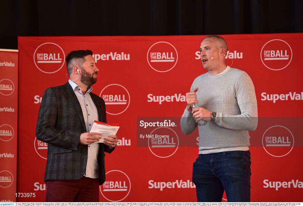 21 June 2019; SuperValu, Ireland’s largest grocery retailer with over 220 stores nationwide, teamed up with Ireland’s leading sports broadcasters, Off The Ball, to bring their award-winning show on the road this summer, to celebrate SuperValu’s 10th year as sponsor of the GAA Football All-Ireland Senior Championship. Joined by a host of special guests, the first stop on the SuperValu Off The Ball roadshow was St Finbarr’s National Hurling and Football Club in Togher, Co. Cork, which took place on Thursday 20th June. Pictured are Off The Ball presenters Nathan Murphy, right, and former Kerry footballer and Off The Ball presenter Kieran Donaghy. Photo by Matt Browne/Sportsfile