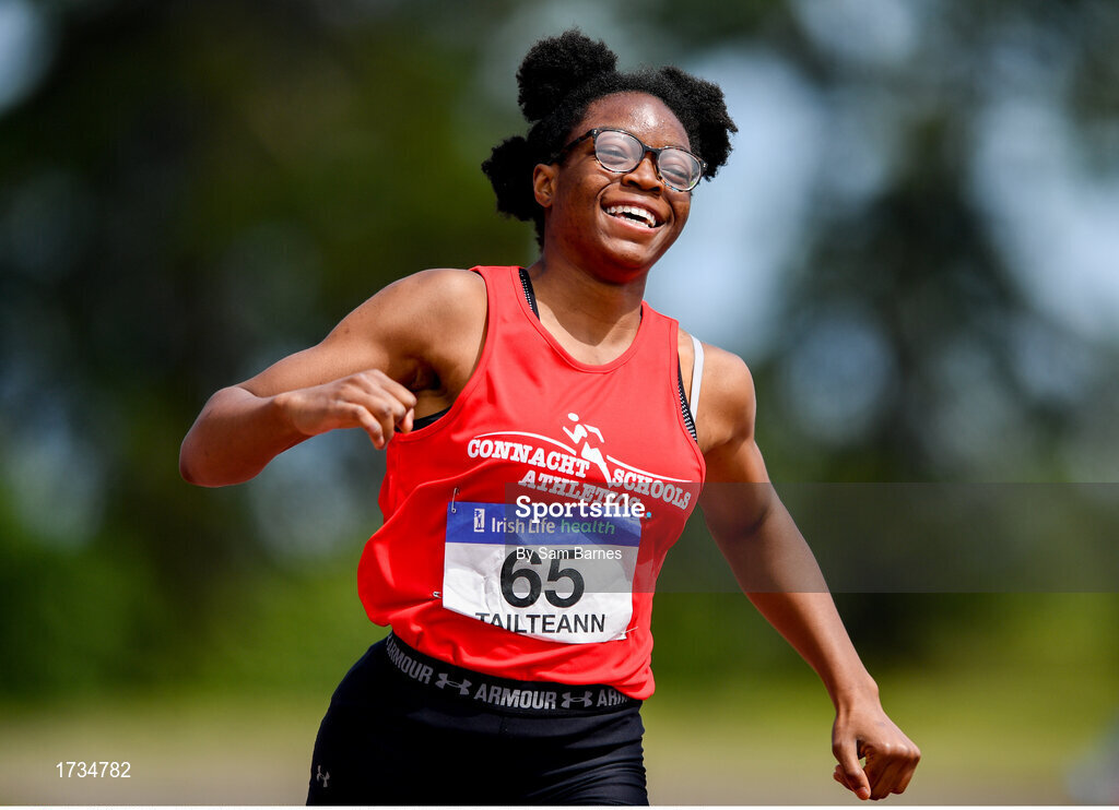 22 June 2019; Yemi Talabi of Moyne CS, Co. Longford, celebrates winning the Girls 100m event during the Irish Life Health Tailteann Inter-provincial Games at Santry in Dublin. Photo by Sam Barnes/Sportsfile