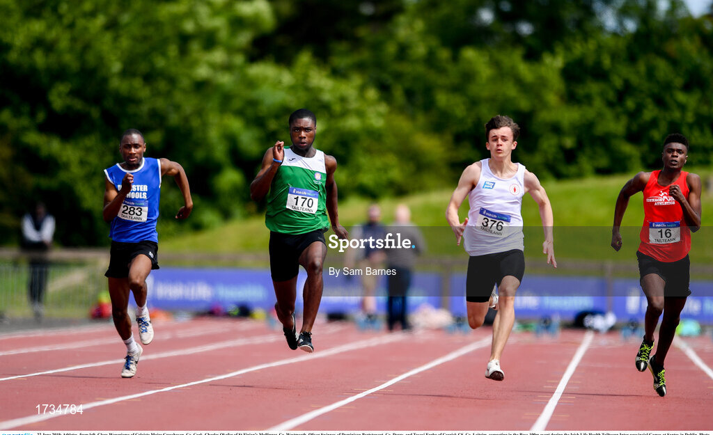 22 June 2019; Athletes, from left, Glory Wenegieme of Colaiste Muire Crosshaven, Co. Cork, Charles Okafor of St Finian’s Mullingar, Co. Westmeath, Oliver Swinney of Dominican Portstewart, Co. Derry, and Toyosi Fagbo of Carrick CS, Co. Leitrim, competing in the Boys 100m event during the Irish Life Health Tailteann Inter-provincial Games at Santry in Dublin. Photo by Sam Barnes/Sportsfile
