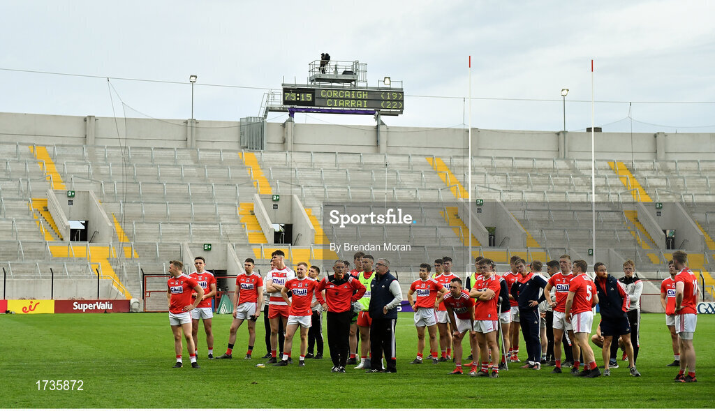 22 June 2019; The Cork squad watch the trophy presentation after the Munster GAA Football Senior Championship Final match between Cork and Kerry at Páirc Ui Chaoimh in Cork. Photo by Brendan Moran/Sportsfile